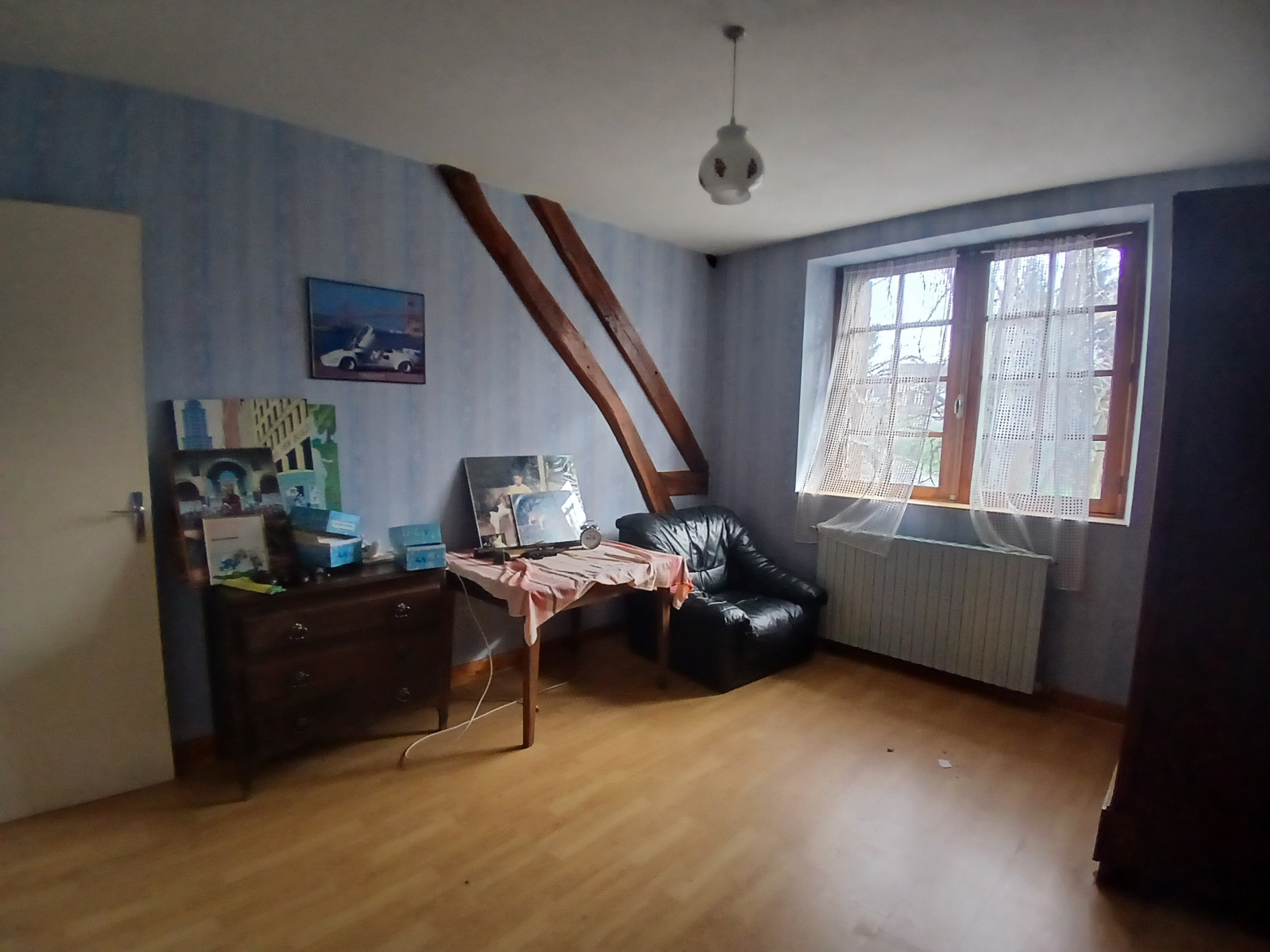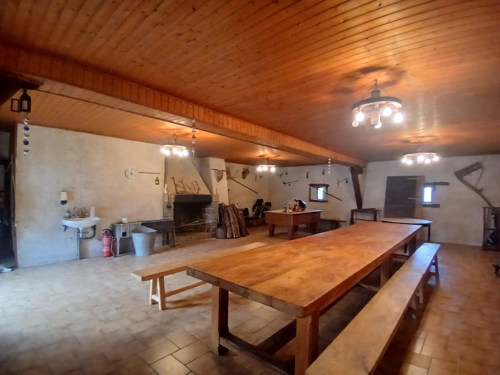 Le séjour cathédrale avec sa cheminée en pierre constitue le cœur de la maison, offrant un bel espace de vie. La propriété comprend également une grande salle avec cheminée, idéale pour des moments conviviaux, quatre chambres spacieuses, ainsi qu’un jardin en façade.