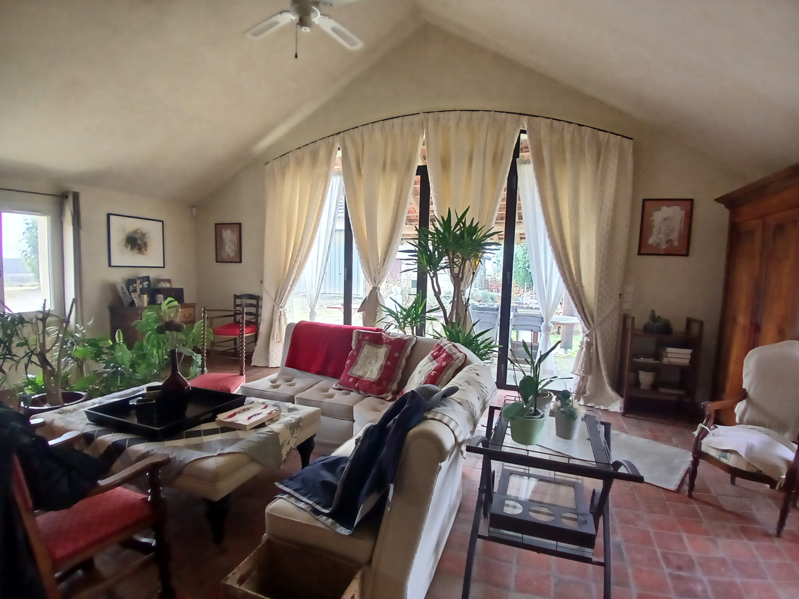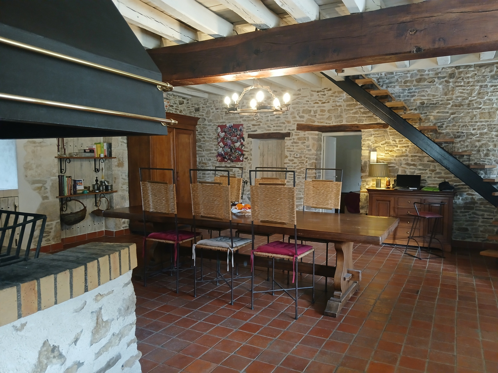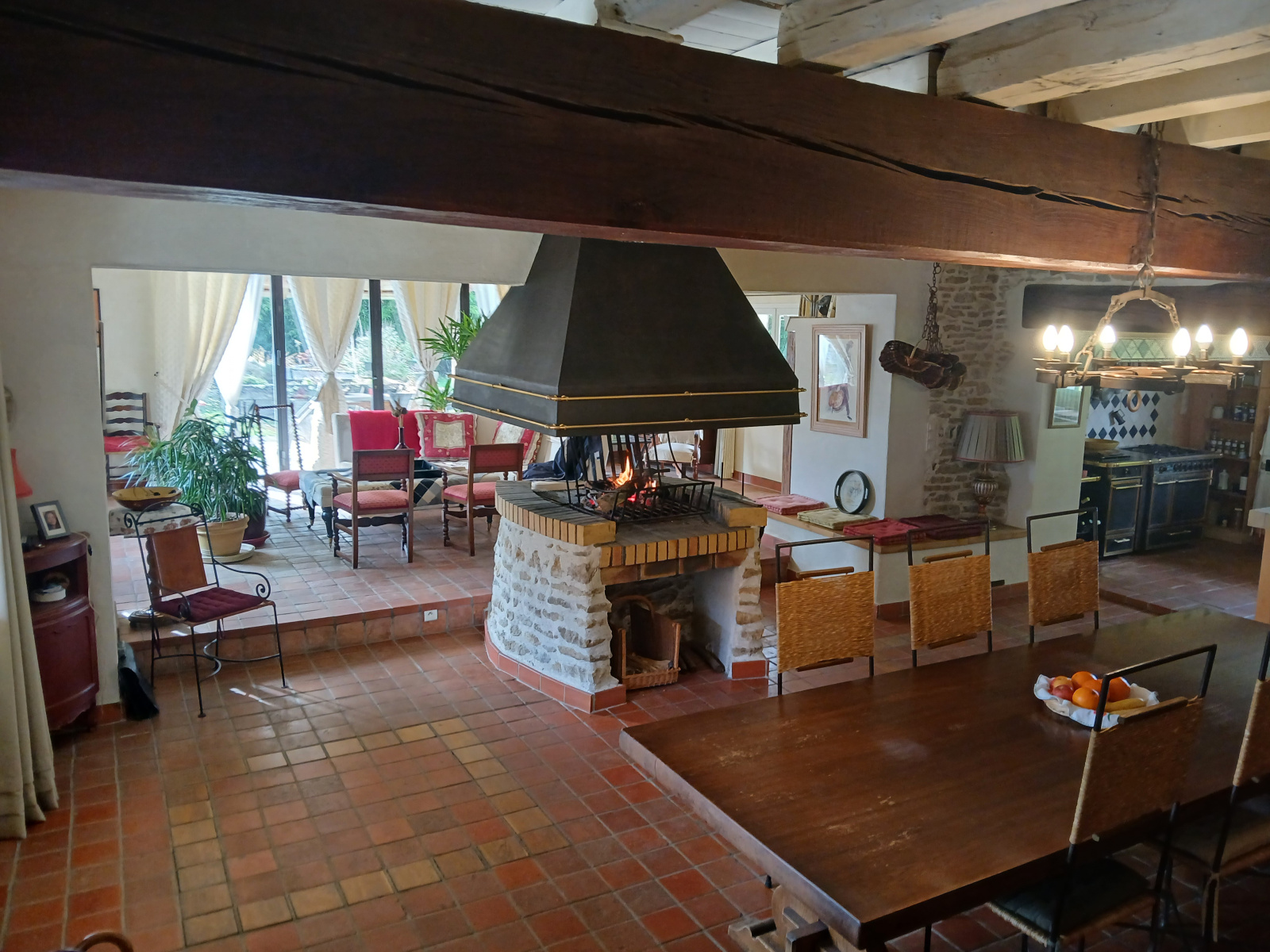 L’habitation principale est habitable de suite et propose de vastes volumes avec une décoration soignée. Le séjour d’environ 80 m² bénéficie d’une triple exposition, d’une cheminée centrale spéciale cuisson, de poutres en chêne apparentes et d’une grande baie vitrée ouvrant sur une terrasse couverte, idéale pour profiter du calme.