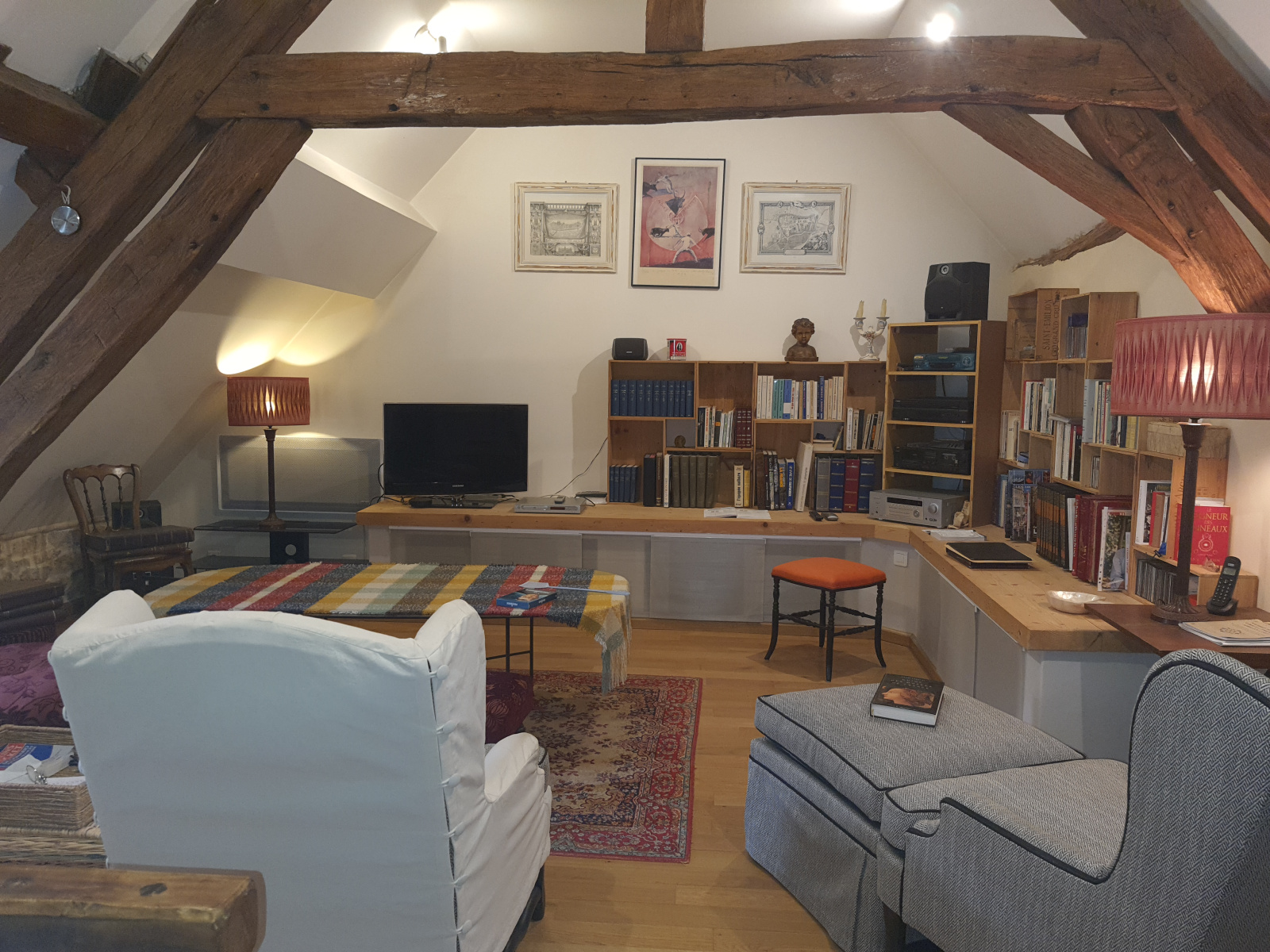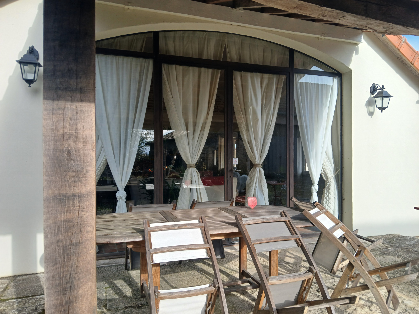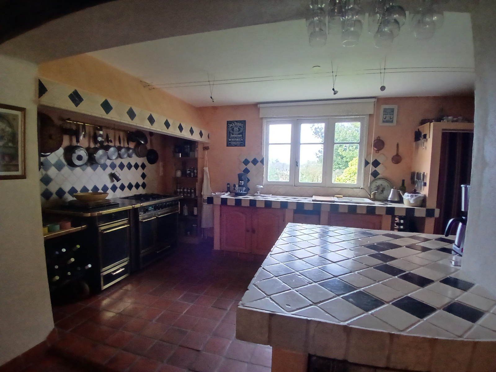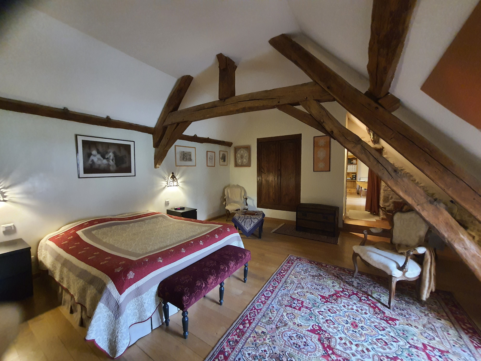 L’habitation principale est habitable de suite et propose de vastes volumes avec une décoration soignée. Le séjour d’environ 80 m² bénéficie d’une triple exposition, d’une cheminée centrale spéciale cuisson, de poutres en chêne apparentes et d’une grande baie vitrée ouvrant sur une terrasse couverte, idéale pour profiter du calme.